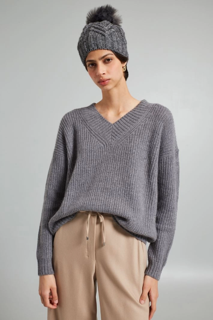 Beanie hat in alpaca, wool and viscose blend yarn, with cable knit and pom pom on top.