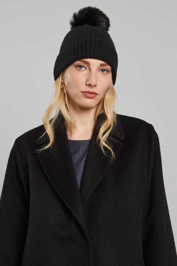 Beanie hat in wool, viscose and cashmere blend yarn, with lamé fiber insert, ribbing, pom pom at the top and turn-up at the edge.