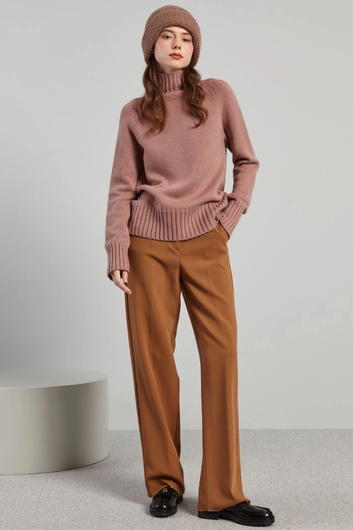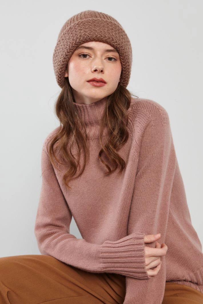 Beanie hat in mohair blend yarn with ribbing and turn-up at the bottom.