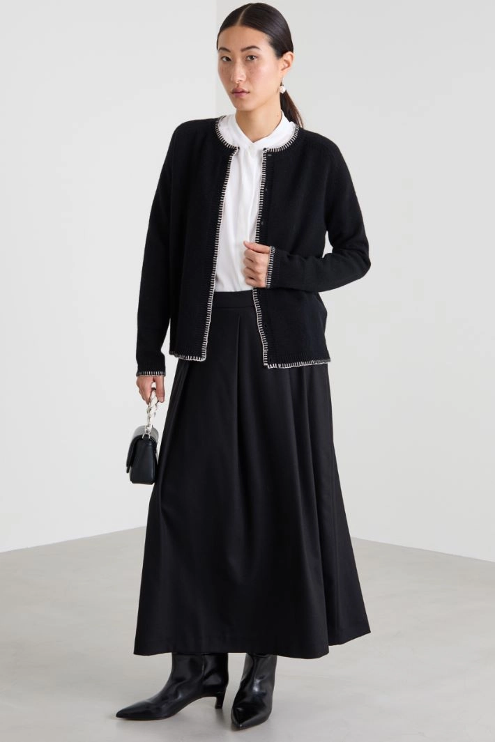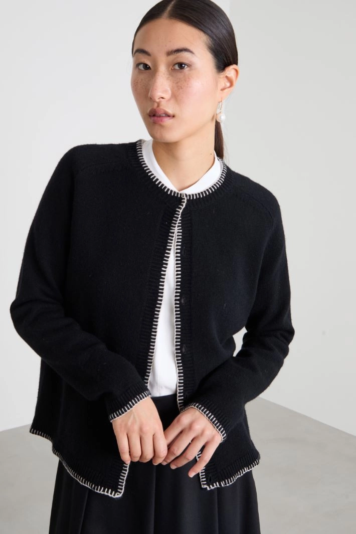 Straight-cut cardigan in wool and cashmere, with round neck, long regular sleeves and contrasting embroidery motif. Front fastening with hidden buttons
