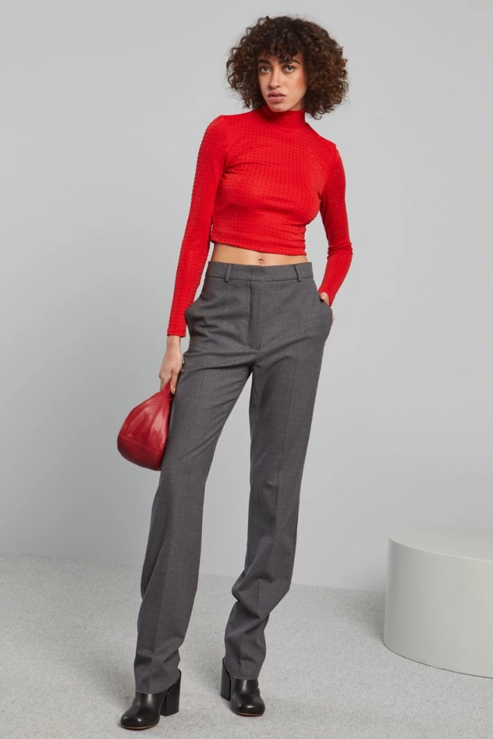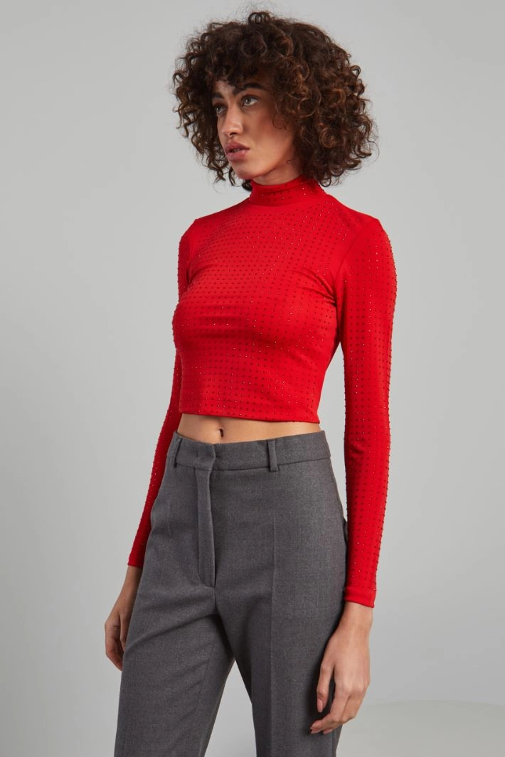 Slim-fit crop top in rhinestone-adorned jersey fabric featuring cut-out detail at the back. Long sleeves and a mock polo-neck, complete with buttons at the back.